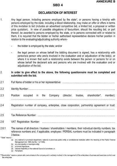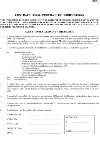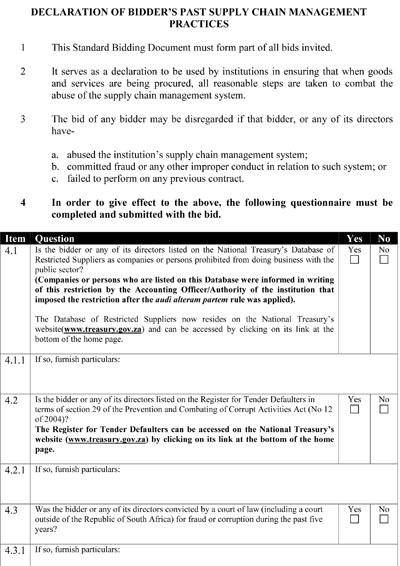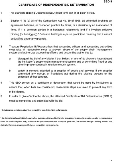 Free Downloads South African Government Supply Chain Management (SCM) Standard Bid Documents (SBD) which you may download and keep. 13. Completed Standard Bid Document samples View Document Download Document 13A. SCM-Bid documents – SBD-1 (.doc) View Document Download Document 13B. SCM Bid documents – SBD-2 View Document Download Document 13C. SCM Bid documents SBD – 3.1 View Document Download Document 13D. SCM Bid documents – SBD-3.2 View Document Download Document 13E. SCM Bid documents – SBD-3.3 View Document Download Document 13F. SCM Bid documents – SBD-4 DECLARATION OF INTEREST View Document Download Document 13G. SCM Bid documents – SBD-5 View Document Download Document 13H. SCM Bid documents – SBD-6.1 View Document Download Document 13I. SCM Bid documents – SBD-6.2 Local Content Certificate View Document Download Document 13J. SCM Bid documents – SBD-7.1 View Document Download Document 13K. SCM Bid documents – SBD-7.2 View Document Download Document 13L. SCM Bid documents – SBD-7.3 View Document Download Document 13M. SCM Bid documents – SBD-8 View Document Download Document 13N. SCM Bid documents – SBD-9 View Document Download Document General Conditions of Contract View Document Download Document Supplier Maintenance Form (Excel) View Document Download Document